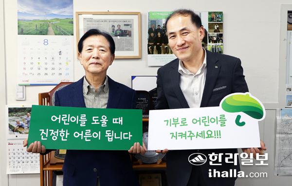 제주도내 지하수개발 전문기업인 (주)진산의 김봉상(왼쪽) 대표는 제주 뿐만 아니라 해외 어린이를 위한 나눔에도 앞장서고 있다. 사진=초록우산 제공