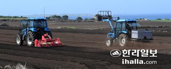 12일 서귀포시 대정읍 한 밭에서 농민들이 무 파종작업을 앞두고 밭에 거름주기 작업을 하고 있다. 이상국기자