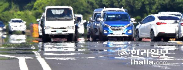 제주 지역에 연일 폭염특보가 이어지고 있는 가운데 17일 제주시 애조로 도로가 뜨거운 지열로 인해 아지랑이가 피어오르고 있다. 강희만기자