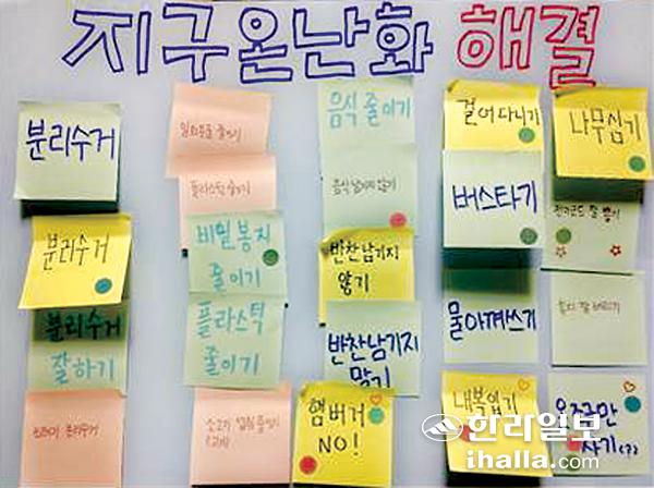 앞으로도 장마와 폭염이 계속 이어질 거라는 기사를 보며 이에 대한 원인과 결과에 대해 분석한 후, 구체적인 실천 방법을 떠올리기 위해 지구환경에 관련된 영상자료도 찾아본다. 그리고 실천 방법들에 대한 의견을 포스트잇에 적는다.
