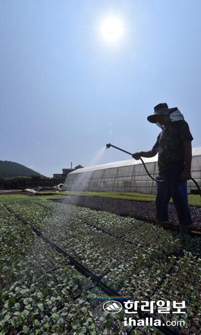 폭염이 맹위를 떨친 19일 제주시 애월읍 곽지리 한 농가에서 파종을 앞둔 양배추 모종에 물이 뿌려지고 있다. 강희만기자