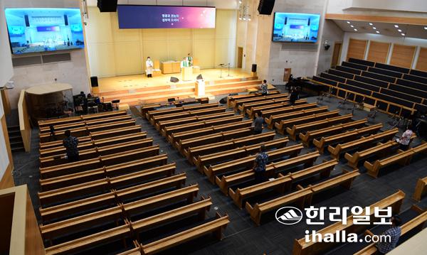 코로나19 확산에 따라 제주지역도 사회적 거리두기가 2단계로 격상된 가운데 일요일인 23일 제주시 아라동 성안교회에서 필수 인력 20명만 참석해 예배를 드리고 있다. 강희만기자