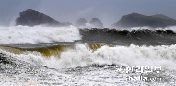 강풍을 동반한 제8호 태풍 '바비'가 26일 오후 제주를 빠져나간 가운데 이날 제주시 한경면 고산리 앞 차귀도 해상에 거센 파도가 밀려들고 있다. 이상국기자