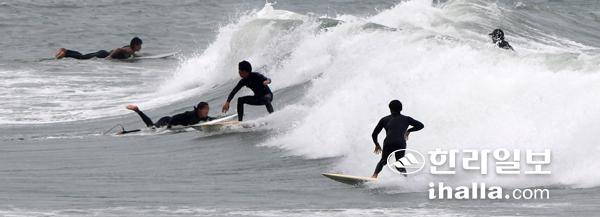 9호 태풍 '마이삭'이 북상중인 1일 제주시 구좌읍 월정해안에서 서퍼들이 높은 파도를 즐기고 있다. 강희만기자