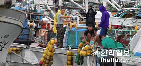 제10호 태풍 '하이선'이 북상하는 가운데 6일 성산포항에 대피한 선원들이 어선 안전점검을 하고 있다. 강희만기자