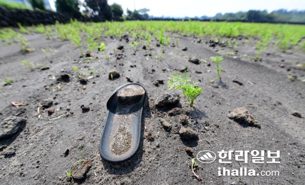 최근 연이은 태풍으로 많은 농작물이 피해를 본 가운데 8일 제주시 구좌읍 종달리 당근밭이 폭우에 휩쓸려 황량한 모습을 보이고 있다. 강희만기자
