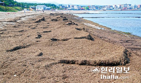 9일 제주시 이호해수욕장 백사장에 지난 태풍 때 파도에 밀려온 퇴적물들이 쌓여 있다. 강희만기자