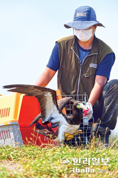 10일 서귀포시 성산일출봉 인근 해안에서 태풍 '마이삭'때 탈진해 한국조류보호협회 제주도지회에 의해 구조됐던 희귀조 갈색얼가니새가 무사히 회복해 자연으로 돌아가고 있다. 국가철새연구센터와 한국조류보호협회 제주도지회는 공동으로 이 갈색얼가니새에 위성추적기를 부착해 이동경로를 연구할 예정이다. 이상국기자
