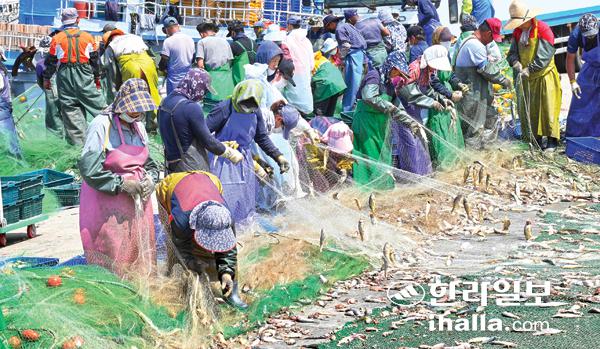 12일 제주시 한림항에서 수확한 참조기를 어선에서 곧바로 내려 어민들이 구슬땀을 흘리며 분류작업을 하고 있다. 이상국기자