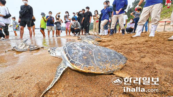 지난 11일 서귀포시 중문색달해수욕장에서 해양수산부 주최로 진행된 바다거북이 방류 행사에서 멸종 위기에 처한 바다거북 18마리를 바다로 되돌려보내고 있다. 이상국기자