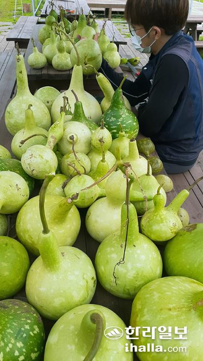 14일 서귀포시 성산읍 수산리 제주자연생태공원의 한 직원이 공원내에서 수확된 조롱박을 정리하고 있다. 강희만기자