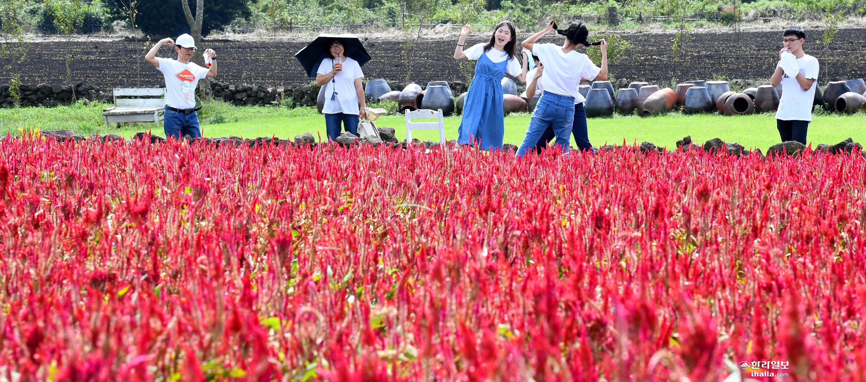 15일 서귀포시 표선면 보롬왓을 찾은 관광객들이 맨드라미를 배경으로 제주의 추억을 남기고 있다. 이상국기자