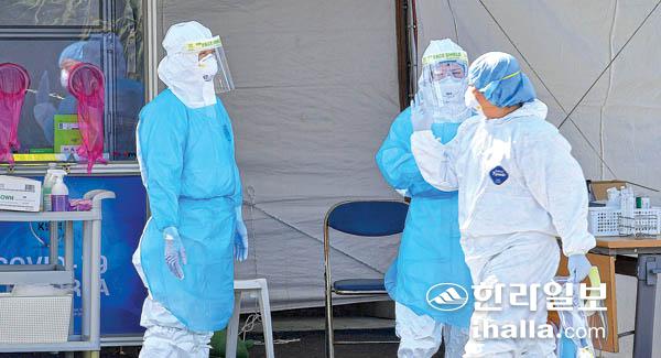 제주에서 가족 3명이 동시에 코로나19 확진 판정을 받은 가운데 15일 서귀포시 대정읍 서부보건소 선별진료소 직원들이 지역주민들을 대상으로 검체 채취를 하기위해 분주히 움직이고 있다. 강희만기자