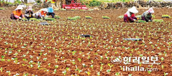 24일 제주시 외도동 일대 한 밭에서 농민들이 브로콜리 식재작업으로 한창 분주한 시간을 보내고 있다. 이상국기자