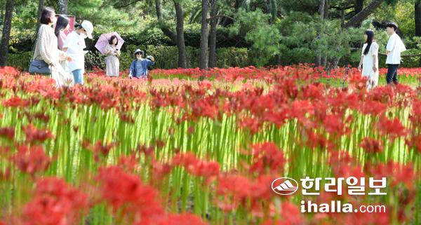 26일 제주시 한림공원을 찾은 관광객들이 꽃무릇을 배경으로 사진을 찍으며 즐거워하고 있다. 이상국기자