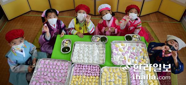 추석을 나흘 앞둔 28일 한복을 곱게 차려입은 제주시 키즈빌어린이집 어린이들이 고사리 손으로 빚은 송편을 보여주고 있다. 강희만기자