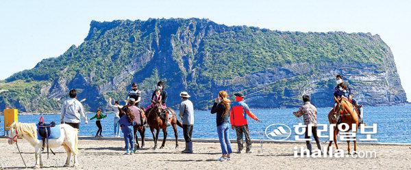 5일 서귀포시 성산읍 광치기해변을 찾은 관광객들이 말을 타고 해안절경을 감상하고 있다. 이상국기자