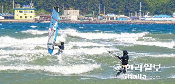 5일 제주시 한림읍 금능해수욕장을 찾은 서퍼들이 강한 바람과 높은 파도를 즐기고 있다. 강희만기자