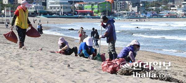 6일 제주시 이호해수욕장에 많은 부유물들이 밀려오자 바다지킴이들이 수거하고 있다. 이상국기자