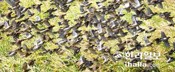 6일 제주시 한경면 고산리 들녘에 어느새 누렇게 익어 고개 숙인 밭벼 이삭을 먹던 참새떼가 인기척에 놀라 날아오르고 있다. 강희만기자