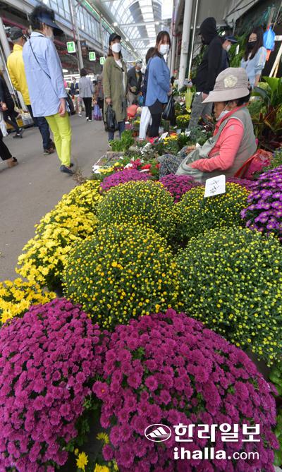 7일 장이 열린 제주시 민속오일시장에서 활짝 핀 국화꽃이 판매되면서 시장을 찾은 시민과 관광객들에게 가을 향기를 선물하고 있다. 강희만기자