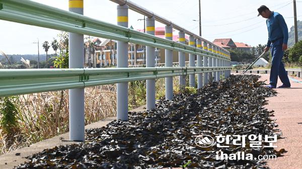 11일 제주시 구좌읍 해안가에서 한 어민이 감태말리기 작업으로 분주한 시간을 보내고 있다. 이상국기자