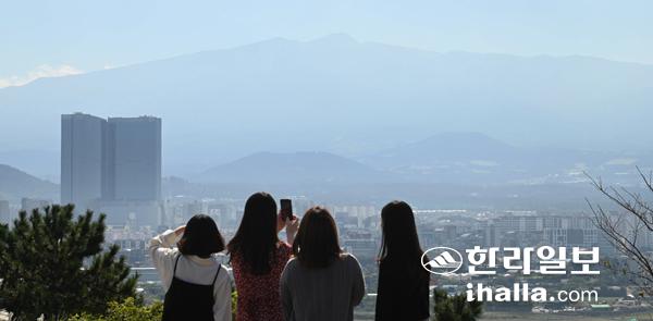 맑은 날씨를 보인 12일 제주시 도두봉 정상을 찾은 관광객들이 한라산을 보며 즐거운 시간을 보내고 있다. 이상국기자