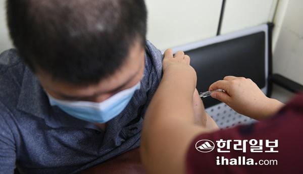전도민을 대상으로 독감 백신 무료 접종이 시작된 13일 제주시 한마음병원에서 한 시민이 접종 주사를 맞고 있다. 이상국기자