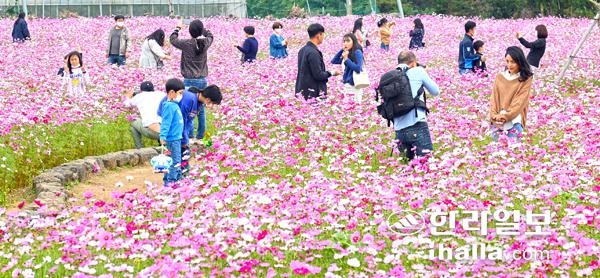 18일 제주시 애월읍 항몽유적지에 코스모스가 만개하자 관광객들의 발길이 이어지고 있다. 이상국기자