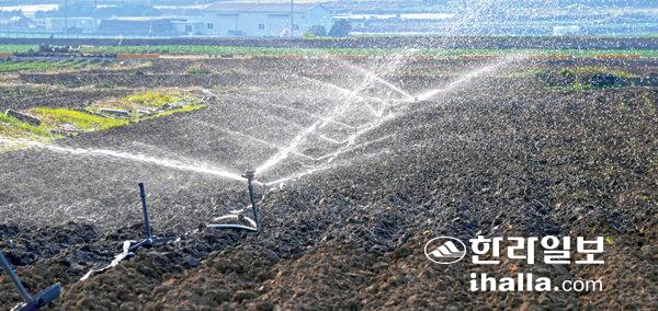 가을가뭄에 애타는 농촌19일 제주시 한경면 고산리의 한 밭에서 스프링클러가 힘차게 돌아가며 물을 뿌리고 있다. 강희만기자