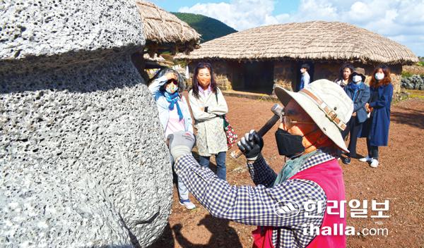 제주돌문화공원관리소가 20일 공원 내 전통초가에서 '전통초가마을 문화체험프로그램'의 하나로 송종원 대한민국 석공예 명장을 초청해 국립민속박물관에 전시된 돌하르방 1기를 재현하는 제작 시연을 벌이고 있다. 전통초가마을 체험 행사는 석공예, 감물염색으로 나눠 진행되고 있다. 강희만기자