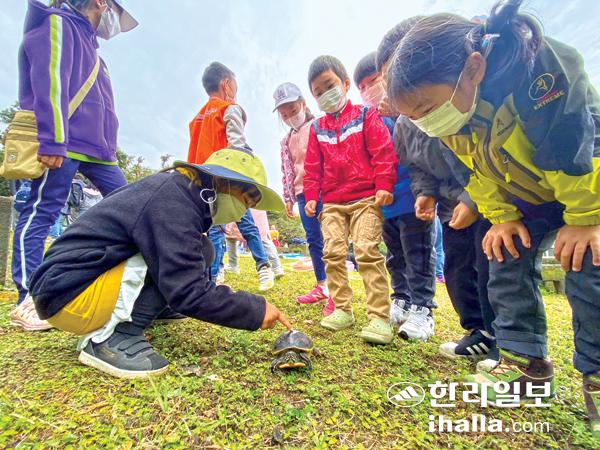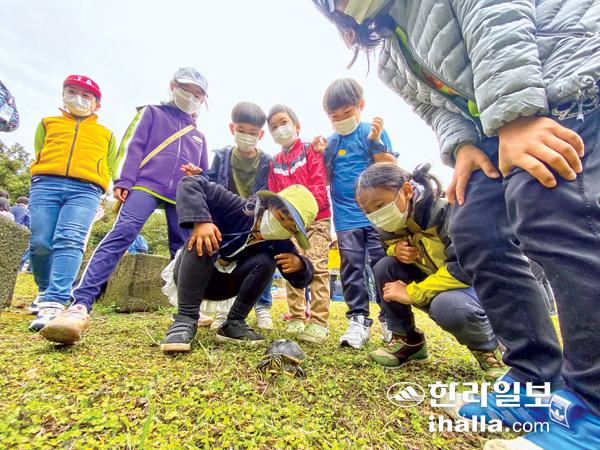 22일 제주시 조천읍 동백동산습지센터를 찾은 풍천초등학교 어린이들이 붉은귀거북을 보며 숲학교 체험을 하고 있다. 이태윤기자