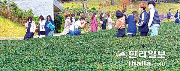지난 24일 서귀포시 안덕면 오설록 티 뮤지엄을 찾은 관광객들이 녹차밭을 배경으로 기념사진을 찍고 있다. 이상국기자