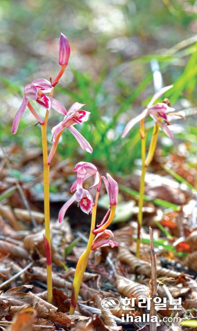 27일 서귀포시 상효동 난대아열대산림연구소에 때아닌 대흥란(환경부 지정 멸종위기식물 Ⅱ급)이 꽃망울을 터트려 눈길을 끌고 있다. 대흥란은 6월에서 7월에 꽃이 피며 가을에 열매를 맺는 난초이다. 강희만기자