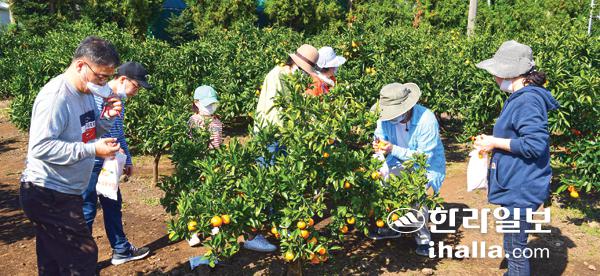 28일 서귀포시 남원읍 신례리 휴애리에서 관광객들이 감귤따기 체험을 하고 있다. 강희만기자