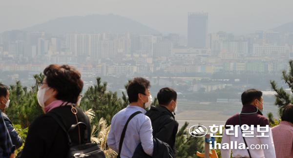 제주지역에 초미세먼지 농도가 '나쁨' 수준을 보인 28일 제주시 도두봉에서 바라본 제주시내가 희뿌옇게 보이고 있다. 강희만기자