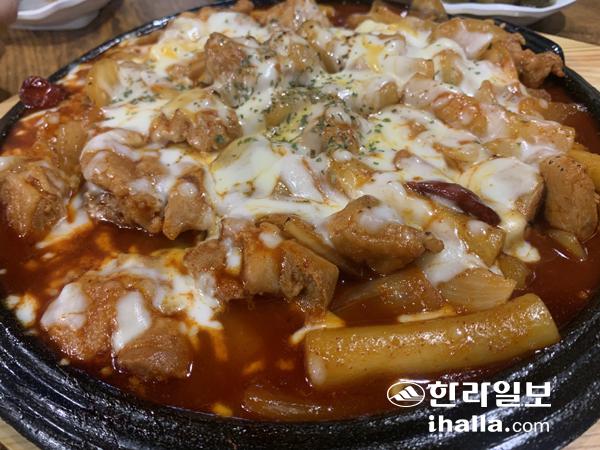 치즈가 올라간 닭떡볶이. 매콤함과 고소함이 입을 즐겁게 한다.