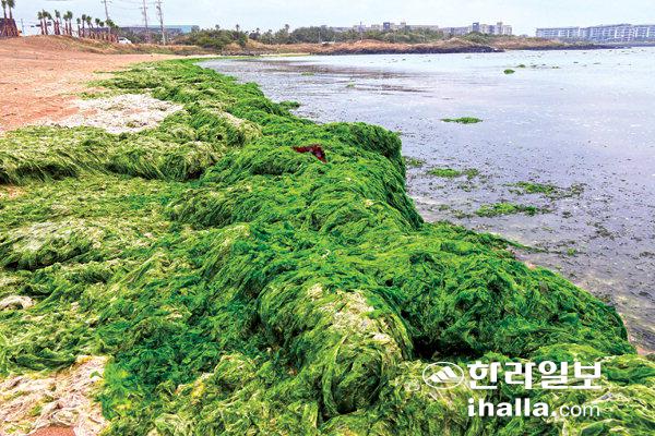 파래가 뒤덮은 해안2일 서귀포시 성산읍 신양리 해수욕장 인근이 제주해변의 골칫거리인 파래로 뒤덮여 미관을 흐리고 있다. 강희만기자