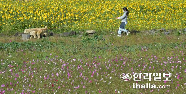 3일 서귀포시 안덕면 서광리 한 카페를 찾은 관광객이 반려견과 함께 만개한 코스모스와 해바라기 사이를 거닐며 깊어가는 제주의 가을 정취를 만끽하고 있다. 강희만기자