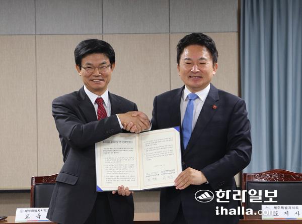 지난 2018년 11월 열린 교육행정협의회에서 이석문 교육감과 원희룡 도지사가 '고등학교 전면 무상급식' 예산편성 지원 등의 내용이 담긴 '제주미래와 교육발전을 위한 공동협력 합의문'을 최종 채택하고 서명한 모습.