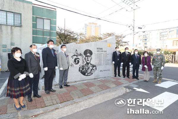 4일 서귀포시 효돈동 주민센터 앞에서 한국전쟁 당시 도솔산 전투에서 전사한 제주 출신 호국영웅 고 김문성 해병대 중위의 명예도로 표지석 제막식에서 내빈들이 기념사진을 찍고 있다. 강희만기자