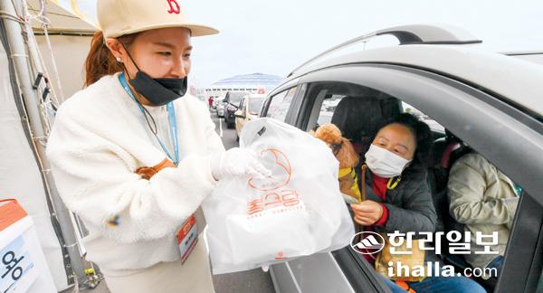 지난 7일 제주시 제주종합경기장 주차장 일원에서 열린 '2020 제주 드라이브 잇쇼'에서 방문객들이 드라이브 스루 방식으로 먹거리를 구입하고 있다. 이날 행사는 사회적 거리두기 조치에 따라 제주의 특별한 맛을 담은 커피·음료, 베이커리·디저트, 간편식·스낵, 반찬·소스 등 물건을 살펴보고 구매할 수 있도록 하기 위해 마련됐다. 이상국기자