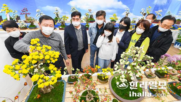 제3회 서귀포시 서홍마을 국화분재 전시회가 서홍동복지회관에서 지난 6일부터 오는 16일까지 열리는 가운데 관람객들이 아름다운 국화 분재를 감상하고 있다. 이상국기자