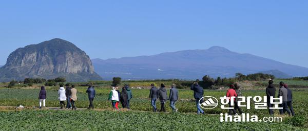 9일 서귀포시 대정읍 알뜨르비행장 일대를 찾은 관광객들이 한라산과 산방산을 배경으로 제주의 늦가을 정취를 만끽하며 걸어가고 있다. 강희만기자
