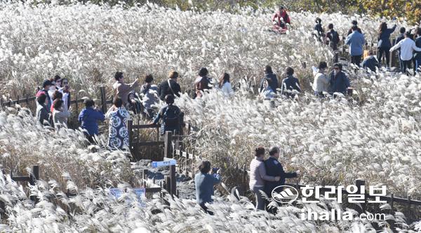 9일 제주시 조천읍 산굼부리를 찾은 관광객들이 억새밭에서 기념사진을 찍고 있다. 이상국기자