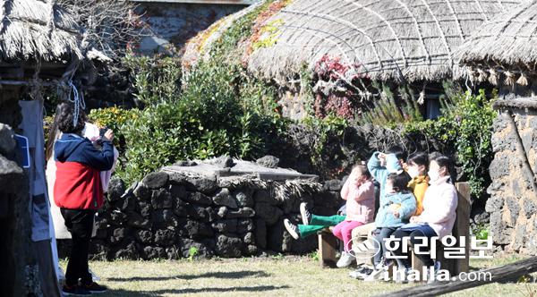 9일 서귀포시 표선면 성읍민속촌을 찾은 아이들이 가을 햇살을 받으며 사진을 찍고 있다. 이상국기자