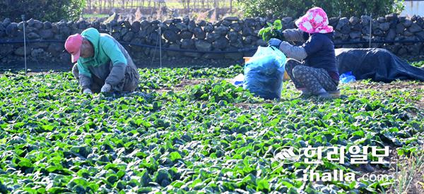 12일 제주시 애월읍 한 밭에서 농민이 시금치 수확작업으로 분주한 시간을 보내고 있다. 이상국기자