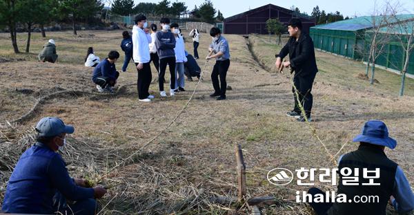 14일 서귀포시 성산읍 수산리 제주자연생태공원을 찾은 제주대학교사범대학부설고등학교 학생들이 제주 전통인 집줄놓기 체험을 하고 있다. 강희만기자