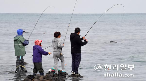 16일 제주시 조천읍 조천리 해안가에서 가족이 함께 모여 낚시를 하며 즐거운 한때를 보내고 있다. 강희만기자