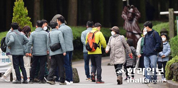 강한 찬바람에 체감기온이 급격히 떨어진 23일 제주시 봉개동 절물휴양림을 찾은 탐방객들이 발걸음을 재촉하고 있다. 강희만기자